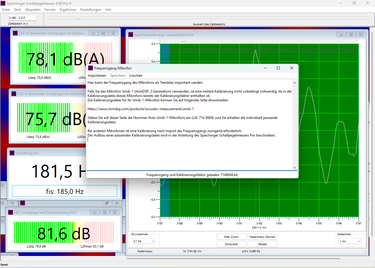 Die kostenlose, werbefreie und datenschutzkonforme Pro- und Pro-II-Versionen der Schallanalyse-Software Spaichinger Schallpegelmesser erlauben (seit Version 4.9) sehr präzise Schallanalyse- und Schallpegelmessungen und eine umfangreiche Auswahl von Schallmessgrößen, und sind damit auch für den professionellen Einsatz bestens geeignet. Die Software erfüllt und übertrifft die Genauigkeits-Anforderungen der gültigen Norm DIN EN 61672-1-2014 für Klasse-1-Schallpegelmesser. Das Terzspektrum der Pro-II-Version erfüllt zudem die Genauigkeitsanforderungen der gültigen Norm DIN EN 61260-1 für Klasse-1-Terzfilter. Falls Sie einen PC (mit Betriebssystem Windows 10 oder Windows 11) und ein Klasse-1-Messmikrofon besitzen, dann erhalten Sie mit dieser Software einen hochwertigen Klasse-1-Schallpegelmesser. Die Kombination aus Spaichinger Schallpegelmesser Pro/Pro II und einem Messmikrofon ist preislich ebenfalls sehr interessant, da es Klasse-1-Messmikrofone bereits ab 114 € (z.B. UMIK-1 von miniDSP) gibt. Ein käufliches Klasse-1-Schallpegelmessgerät kostet hingegen ca. 1500 €. Die Pro- und Pro-II-Version ist bisher ausschließlich für PCs und Tablets mit dem Betriebssystem Microsoft Windows (10 und 11) erhältlich. Beachten Sie bitte unbedingt die Installationshinweise.