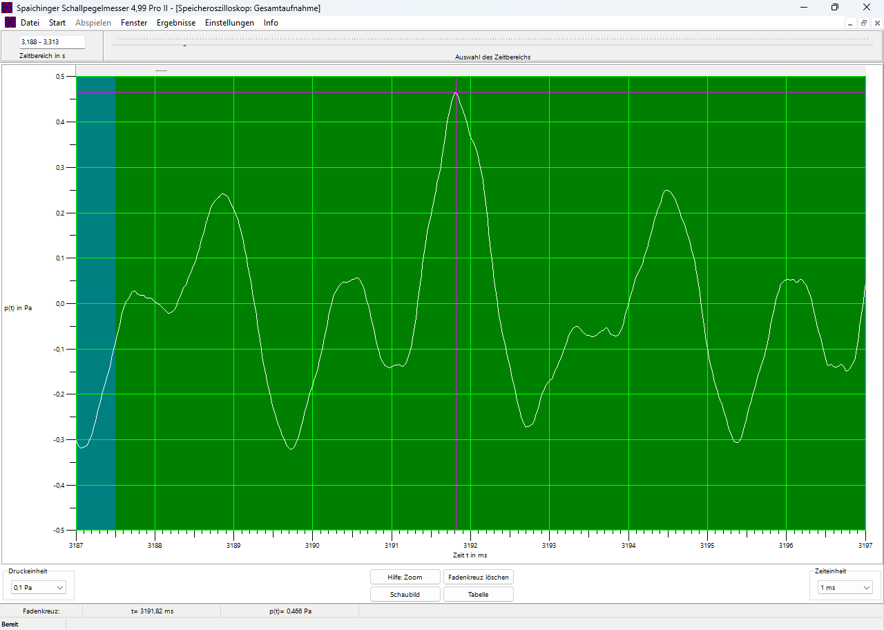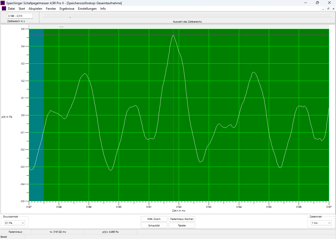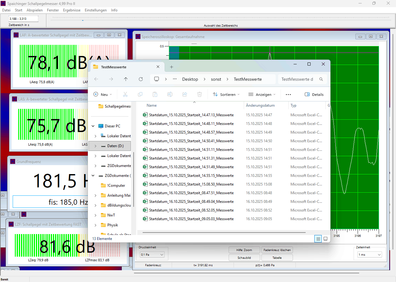Die Software braucht nicht installiert zu werden, d. h., sie kann sogar von jedem USB-Stick aus betrieben werden (portable Software). Alle Messungen werden in Echtzeit durchgeführt und ausgegeben. Die einzelnen Messwerte werden automatisch in einer CSV-Tabelle gesammelt und abgespeichert. Dadurch können Sie auch Langzeitmessungen an Straßen und Arbeitsplätzen durchführen und diese später auswerten. Der Schalldruck (in Abhängigkeit von der Zeit) und das Spektrum können Sie ebenfalls in Form von Tabellen (CSV-Dateien) speichern, um sie anschließend in Excel oder ähnlichen Programmen zu bearbeiten. Dies ist zum Beispiel nützlich, um das Spektrum von verschiedenen Musikinstrumenten oder Stimmen miteinander zu vergleichen. Zum Analysieren oder Stimmen von Musikinstrumenten ist zusätzlich die von der Software mit großer Genauigkeit (+-0,2 Hz) bestimmte Grundfrequenz eines Klanges hilfreich. Die Schaubilder (Schalldruck, FFT-Spektrum und Terzspektrum) können Sie als Bild-Dateien (JPEG) abspeichern. Die Farben von Hintergrund, Gitter und Kurve können Sie vorher beliebig ändern. Dies ist für die Anfertigung von Präsentationen, Protokollen und Klassenarbeiten hilfreich. Mit dieser Software können Sie auch Wave-Dateien aufnehmen und abspielen. Bei der Aufnahme und beim Abspielen werden alle Messwerte und Schaubilder in Echtzeit ausgegeben. So können Sie früher gemachte (kurze) Aufnahmen auch später detailliert analysieren. Zusätzlich kann mithilfe eines Schiebereglers die aufgenommene Wave-Datei manuell analysiert werden, d. h., mit dem Schieberegler können Sie den aktuell angezeigten Zeitbereich beliebig wählen, die dazugehörigen Messwerte und Schaubilder werden dann automatisch angezeigt. Darüber hinaus können Sie mit dieser Software MP3-Dateien öffnen und analysieren. Die Software kann auch als optische "Lärmampel" verwendet werden. Der rote und der gelbe Bereich können vom Anwender beliebig eingestellt werden.